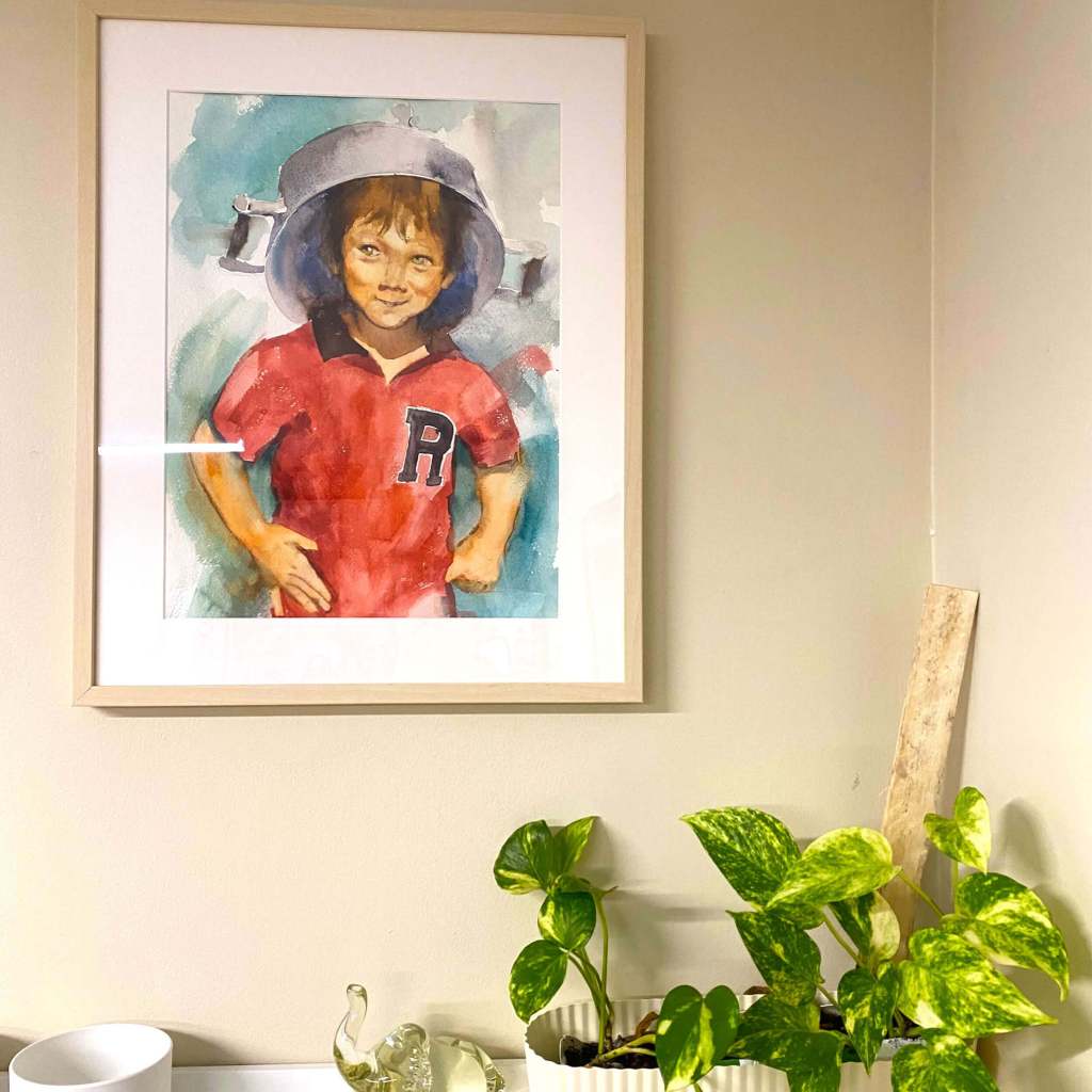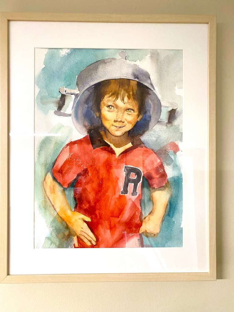 We were at my mother-in-law’s country house, so many family members together laughing and having fun, when my kid comes to surprise us with a pan on his head. We all started laughing, and that’s the only thing we did for a few minutes. A photo was taken but very dark and blurred, although the moment was colourful and happy. So portray that, a portrait! And that’s how the first watercolour of my son came to be.